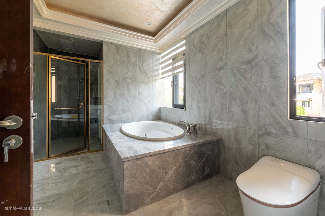 灰色面卫生间,没有采用干湿分离,仿大理石的瓷砖充满了房间的每一个角落,自然的纹理勾勒舒适的氛围,浴缸,马桶,洗脸盆,通通都装纯白色,一深一浅实力打造INS风。