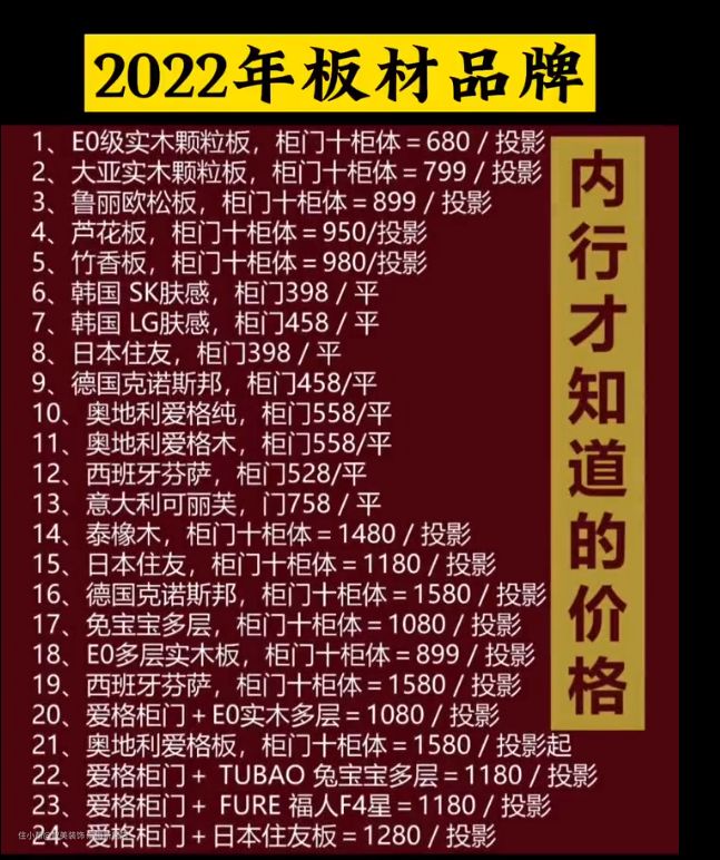 第二板材是什么品牌呢?他给你说一堆,可能你也没懂,没关系,我把常见的板材品牌放在了最后,你都可以去参考一下