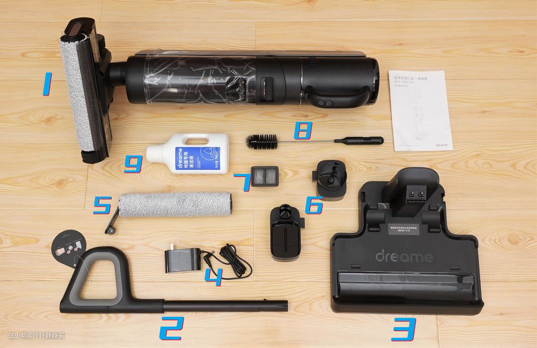 1、机身(含滚刷、清水箱、污水箱、电机) 2、手柄组件 3、充电底座 4、电源适配器 5、备用滚刷 6、收纳盒(2个) 7、备用滤芯 8、清理刷 9、清洁剂。 外加1本说明书。