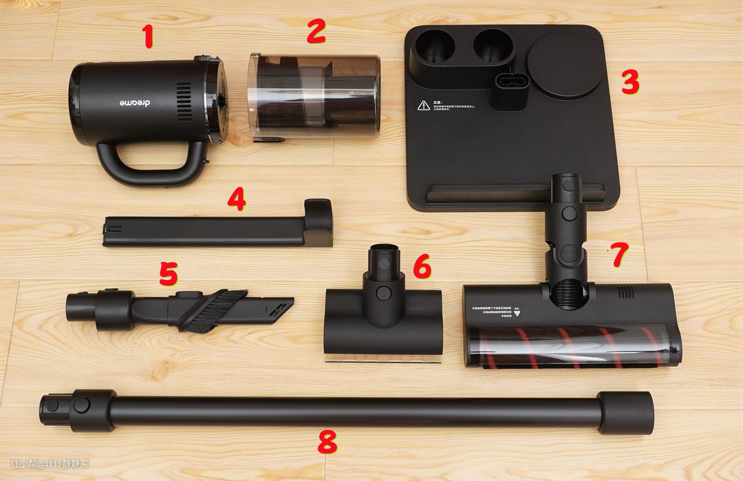 1、电机 2、尘杯组合 3、附件收纳支架座 4、收纳支架杆 5、二合一扁吸头 6、电动除螨吸头 7、软绒滚刷吸头 8、延长杆。