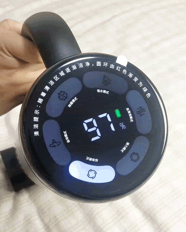 智能脏污感应和变频吸力调节两个功能让你仿佛在开自动挡汽车。拖着洗地机走就行。吸力大小、出水量多少,会根据地面脏污情况自动调节。并通过显示屏最外圈的颜色变化,提示你是否清理干净?