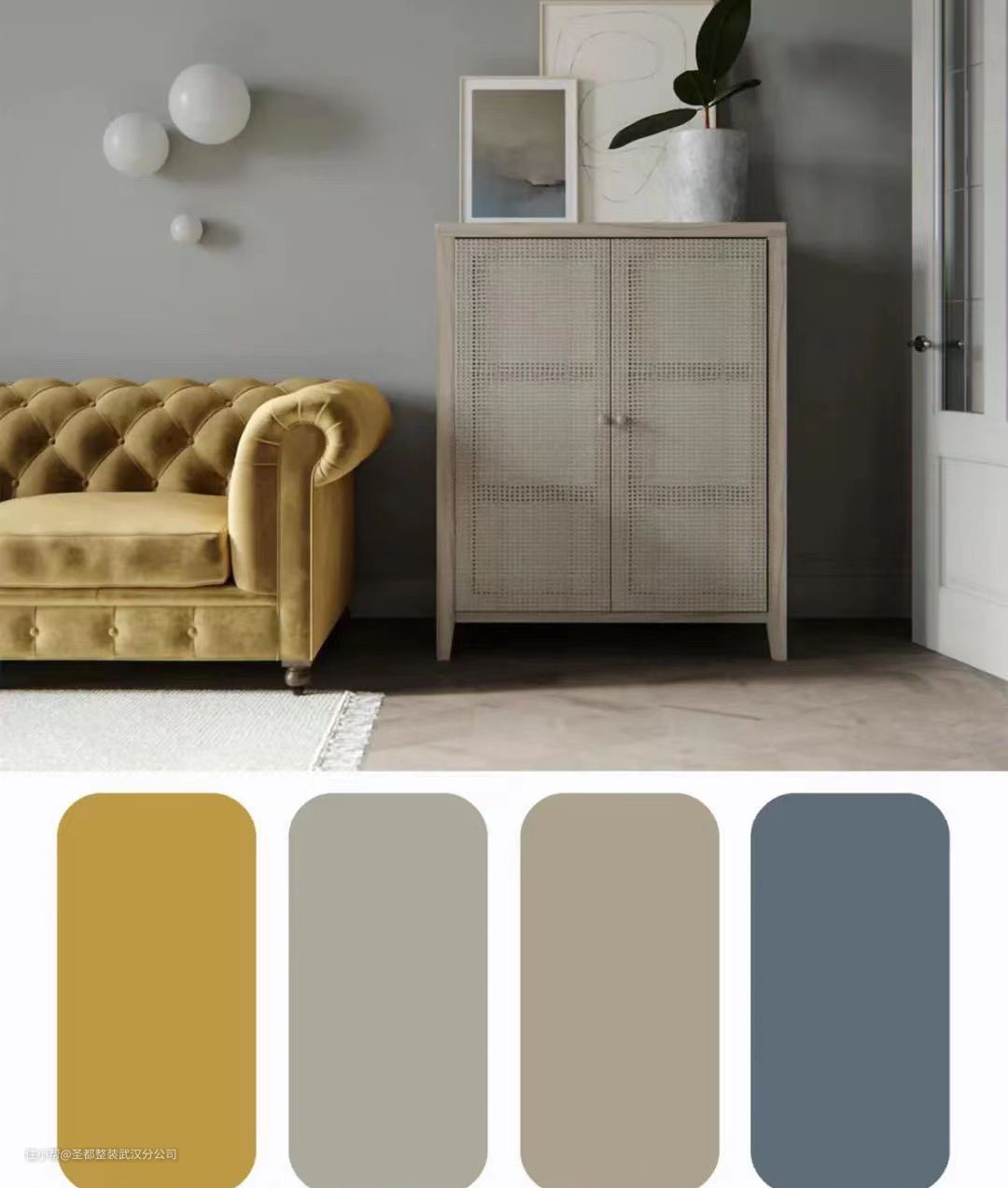 ️️⭐️浅灰色墙面打底,搭配芥子色绒布沙发、茶鼠色藤编柜、蓝鼠色装饰画,含蓄的精致。