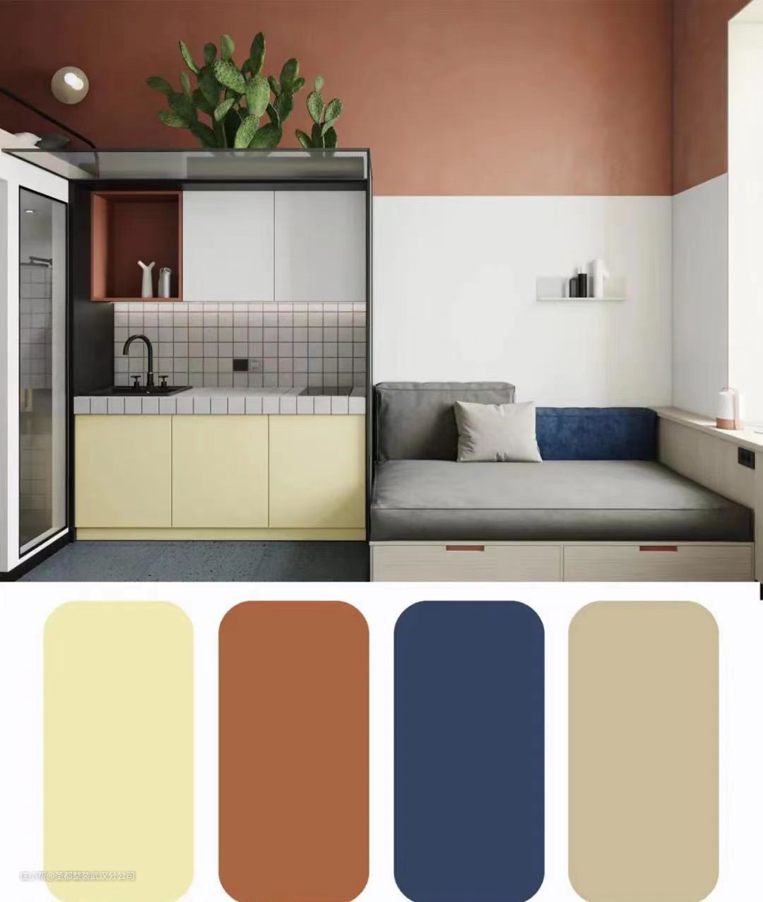 ️️⭐️墙面灰茶色乳胶漆和白色做拼色,加鹅蛋浅黄色的柜体,再点缀少量普蓝色软装,演绎不一样的小公寓私人空间,内敛又不失活泼。