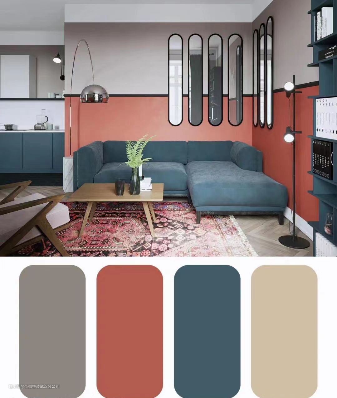 ⭐️️栗梅色+灰色做墙面拼色,搭配靛蓝色柜体和沙发,再配上波西米亚风地毯,现代感与民族风兼具。