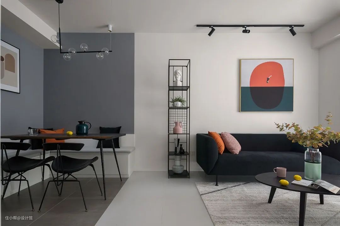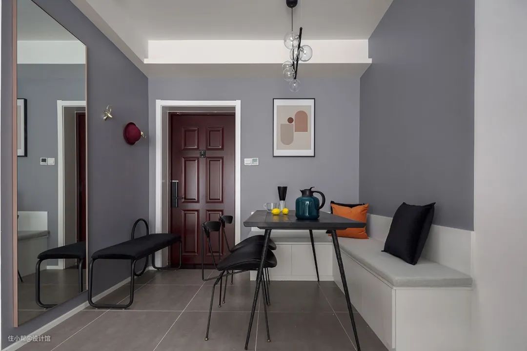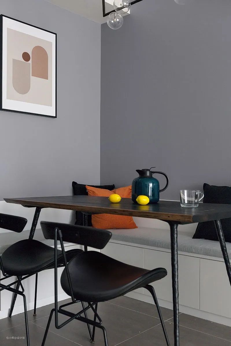 ▲餐厅靠近大门区域,布置换鞋凳+全身镜,可以感受到一种精致简约的仪式感。黑色餐桌椅组合,靠墙定制L字形的卡座,使得面积不大的餐厅也呈现出一种文艺端庄的用餐空间。