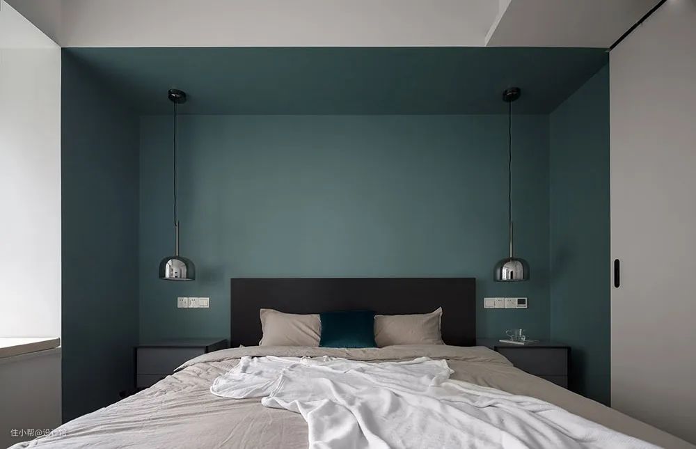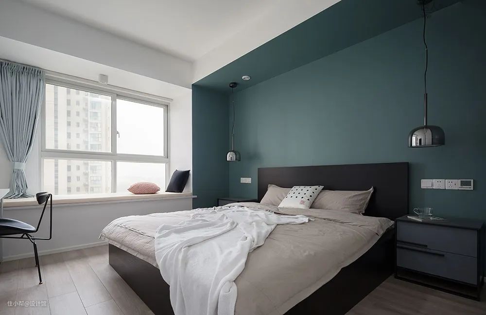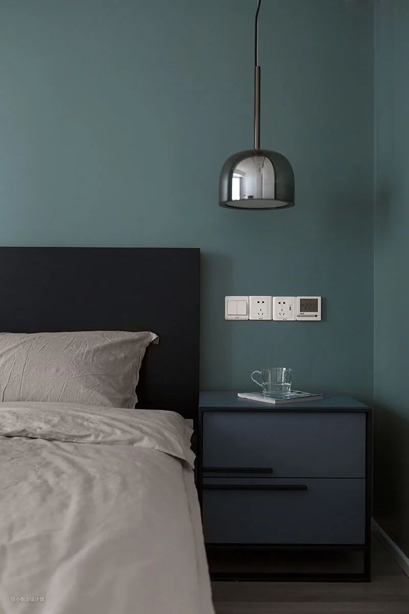 ▲卧室以深蓝色床头墙+米白色墙面空间的搭配,布置上一张黑色实木床铺,布置灰白配的床单,呈现出一种端庄稳重而舒适轻松的睡眠环境,躺在这里睡觉你能感受到一种安静舒适的气息。