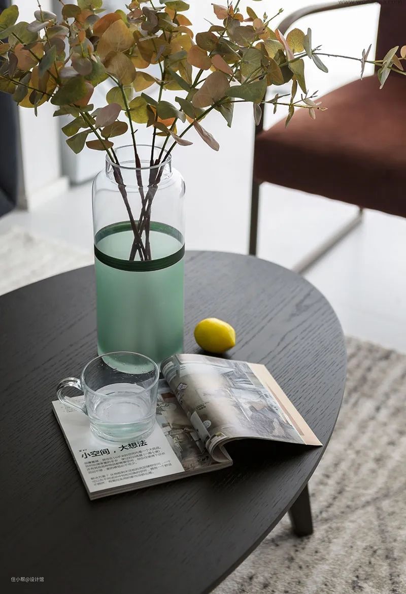 ▲茶几上布置杂志、花瓶与玻璃杯,整个设计现代简洁而清新舒适。