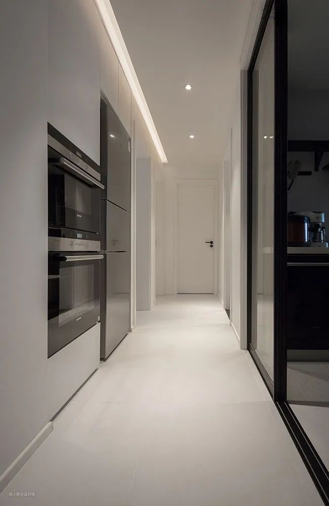 ▲过道侧边的角落空间做了嵌入式的冰箱与电器柜,让厨房操作空间更加宽敞,同时也让原本浪费的边角面积得到最优化的利用。