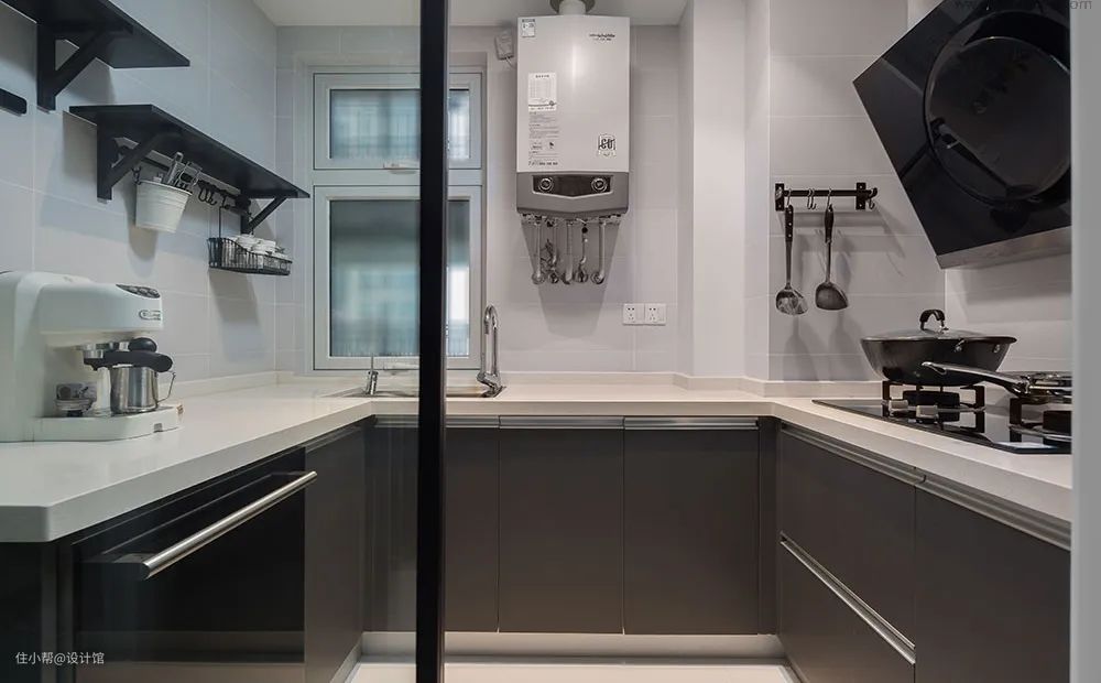 ▲厨房以U字形的操作台空间,为主人提供了宽松实用的烹饪环境;定制灰金色的橱柜,整个空间显得简洁自然而实用。