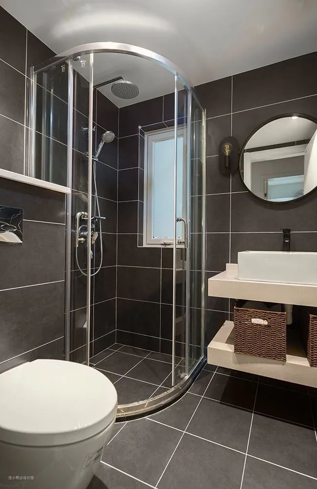 ▲卫生间以灰色的墙面地面砖,装一个弧形的淋浴房,三角分布马桶、淋浴与洗手盆功能,整个空间虽是紧凑却也实用大方。