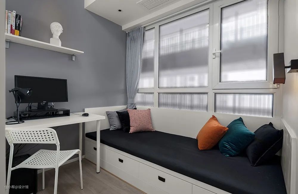 ▲书房定制小榻榻米,布置一张白色简约的书桌椅,书桌上方还装了一个悬空书架,整个空间面积不大,却为主人提供了一个工作加班、临时客房的多功能空间。