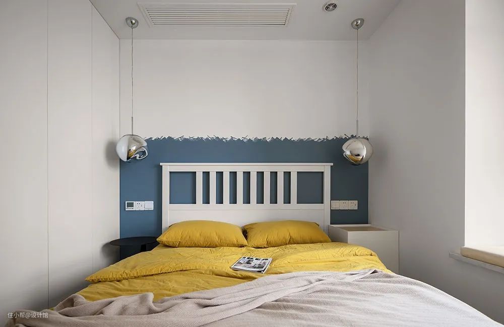 ▲儿童房的背景墙以蓝色+白色拼色墙的设计,蓝白中间的衔接也不是界限分明的线条,而是相互交融的设计,起到一种独特的延伸设计感。布置一张白色实木床,左侧黑色右侧白色的床头柜搭配,两侧分别装了银色的吊灯,布置黄色的床单,也让儿童房空间显得简洁大方而鲜艳活力。