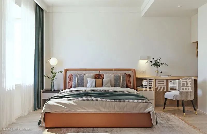 主卧延续了客厅的基调,依旧是洁白的墙面,简约的摆件装饰,再添几分绿意。无主灯的设计贴心地呵护主人的视觉体验,睡眠区与洗漱区用柜体+长虹玻璃的形式加以隔开,传递出朦胧的美感。