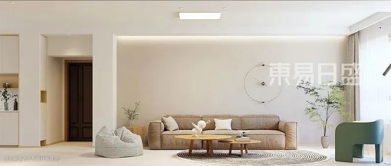 白色为主色调,原木色贯穿其中,绿色作为分外的点缀,为客厅带来清新简洁的质感。一字型米咖沙发、开放式储物格、通透的玻璃挂钟……软装设计回归实用性,将极简的设计理念体现得淋漓尽致。