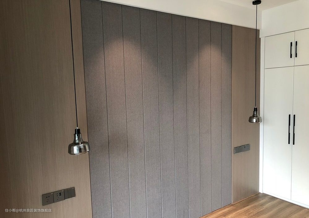 床背造型木饰面呼应客厅沙发背景墙,搭配灰色布纹的软包背景材质,质朴典雅