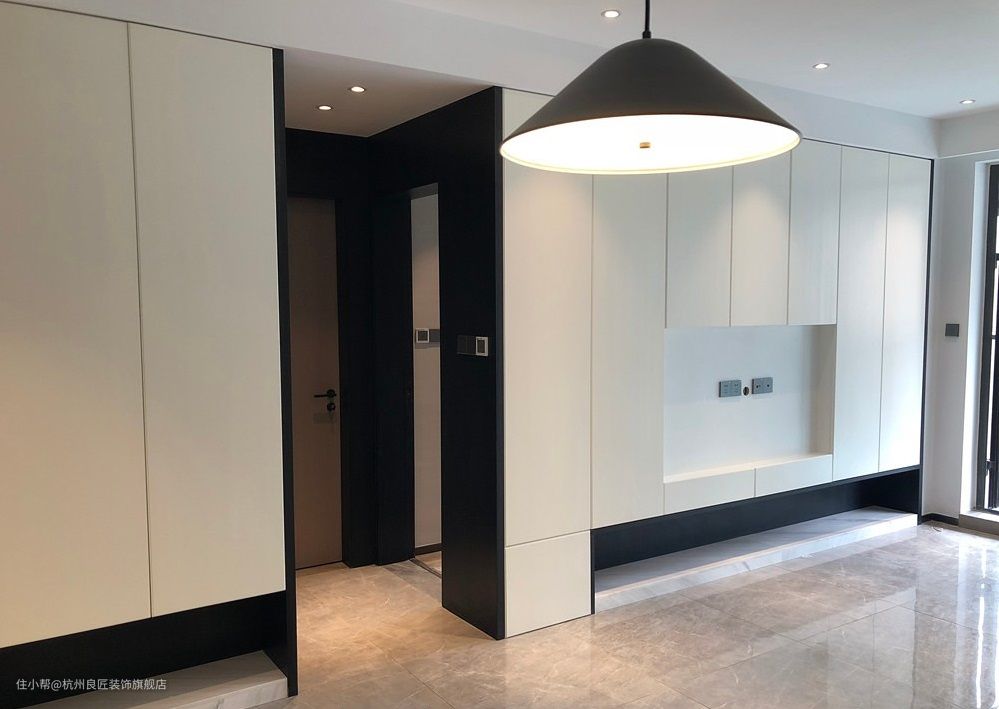 电视背景墙做了整面储物柜体纯白色的柜门与嵌入式的电视机位,搭配爵士白大理石加黑色木饰面点缀。