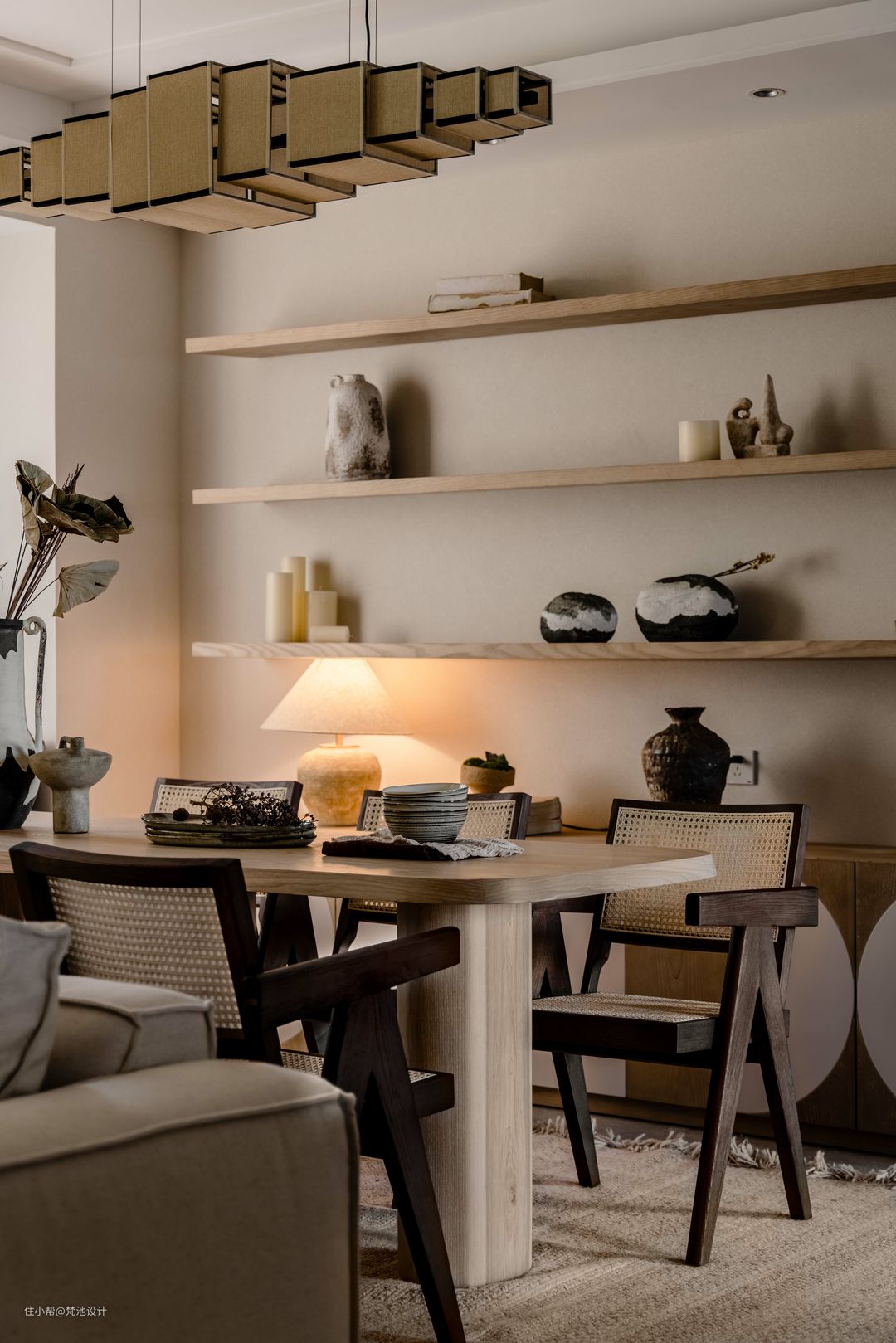 从餐桌到吊灯,无一不采用原木材质,为空间增添了许多自然元素。枯枝花艺、棉麻地毯、手工瓷碗等饰品,是设计师在空间中对细节把控和对自然风格深刻剖析的体现。