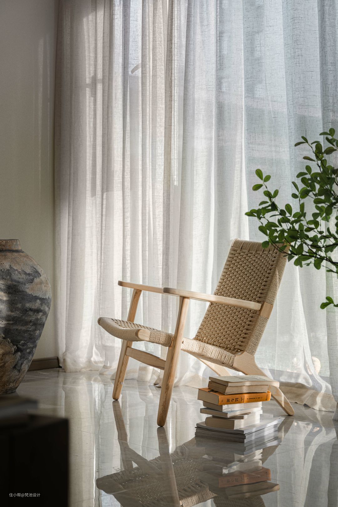 阳台的藤编吊灯和落地陶罐,打造「休闲一角」