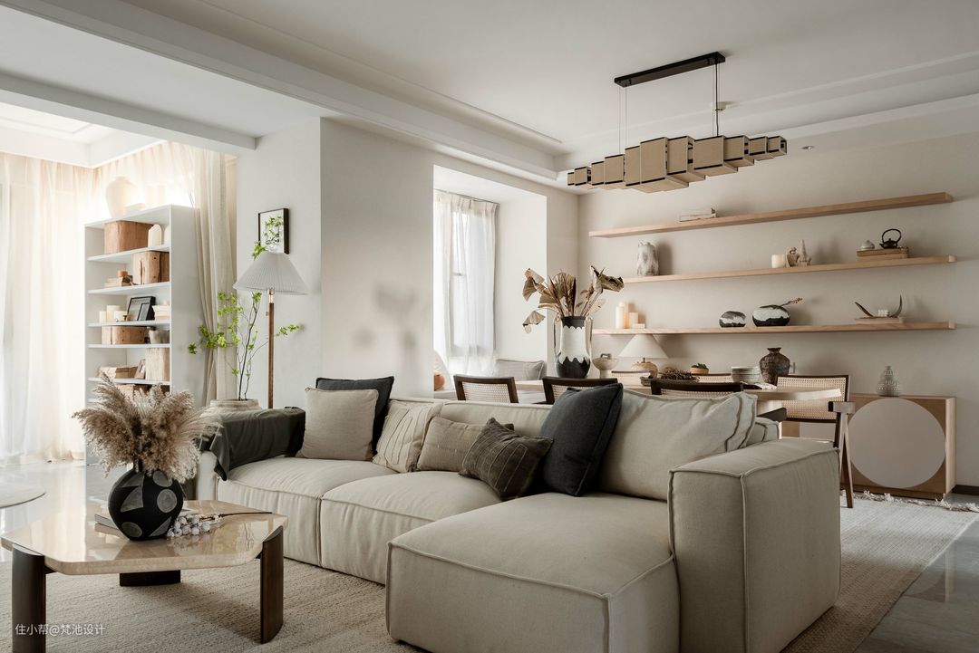 客厅沙发选用素色柔软布料,与原木材质的茶几和餐桌椅组合搭配,独具风格的手工陶罐和摆件点缀,在平淡的生活空间中窥见质朴极简之美。