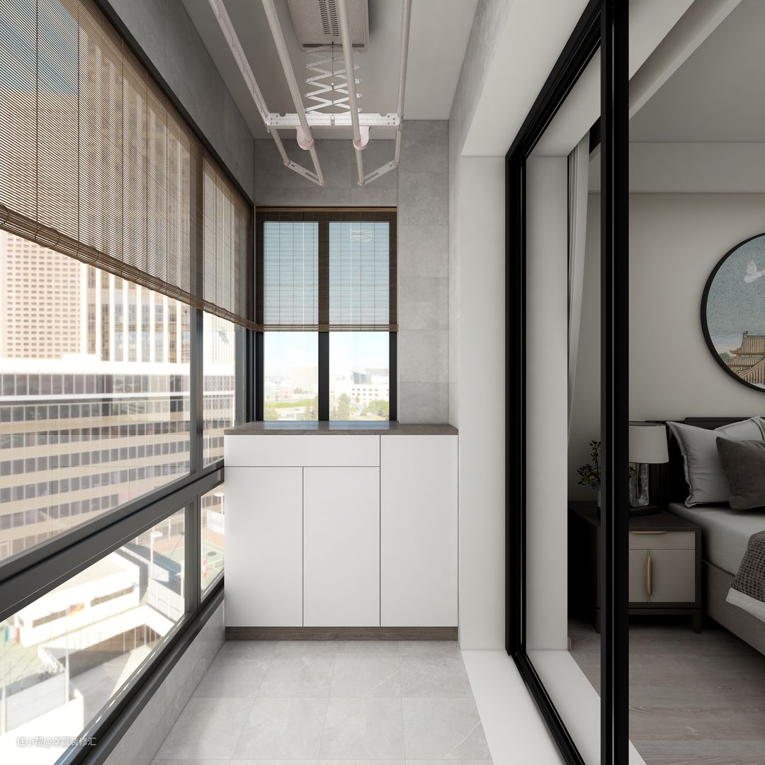 无论阳台封闭与否,小幸都建议您规划一个合理的阳台家务区,将阳台靠玻璃的一端留出来做家务区,洗衣区、保洁用品的收纳区都可置于此。家务区的对面一定要多安装一些柜体用于收纳,这样一侧洗衣,一侧收纳,隔而不分,非常实用。