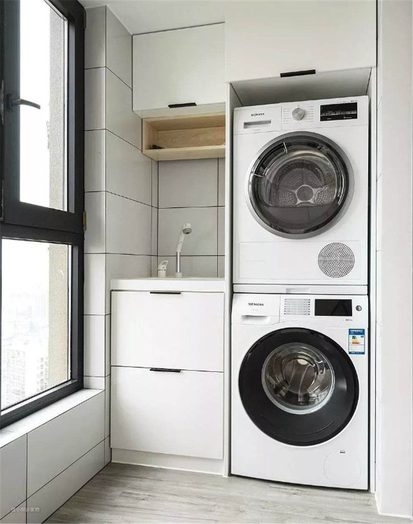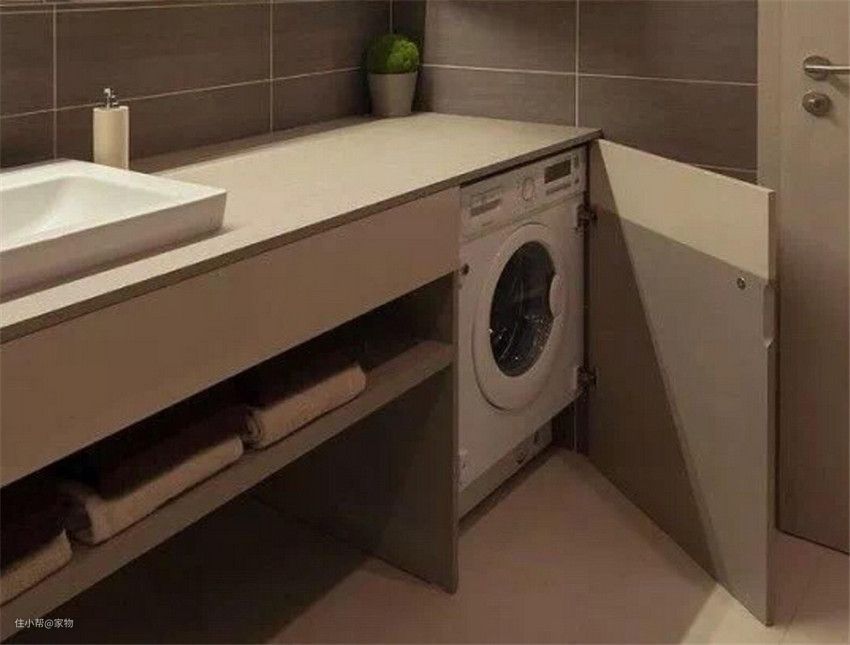 若洗衣机要塞进柜子,提前选好洗衣机,严格把控定制柜体尺寸,尽量做到合适。