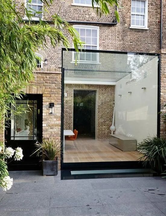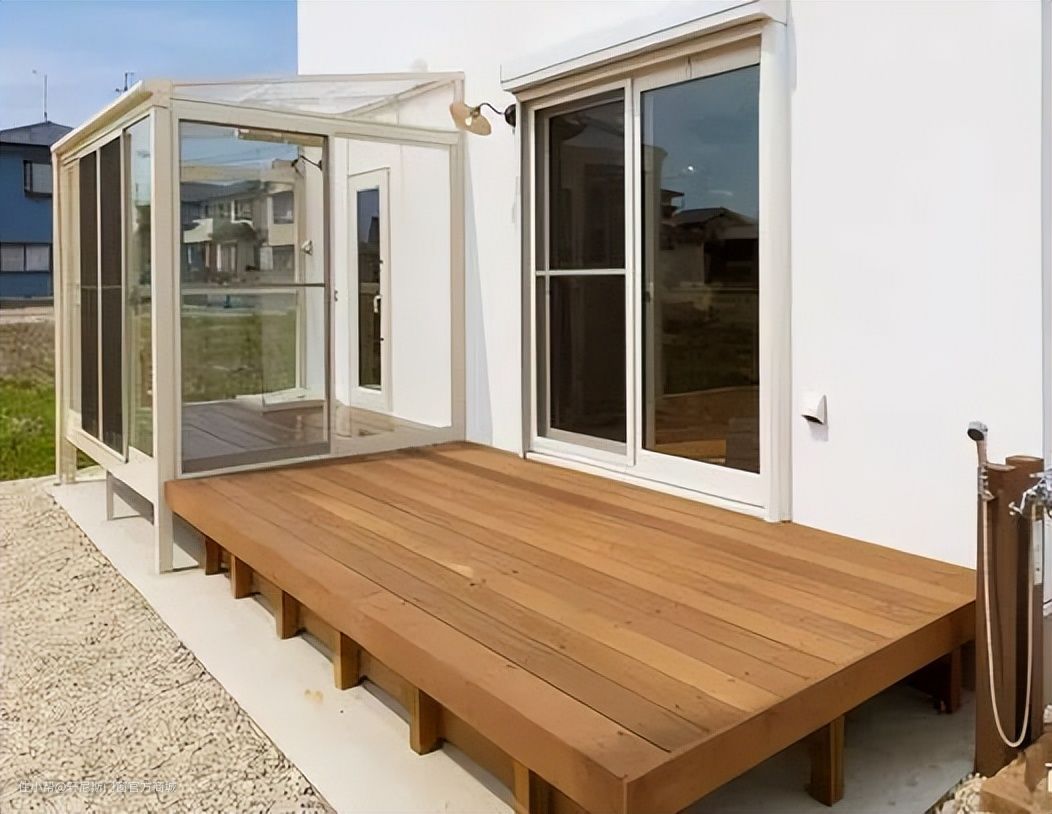 如果门前面积够大的话,也可以拓宽当阳台或者休闲区使用,周围用玻璃封起来,这不就是阳光房了吗?