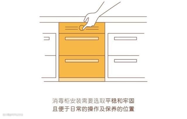 (1)消毒柜应安装在平稳牢固,且便于日常的操作及保养的地方,若表面不平会造成柜门的歪斜和错位。建议安装在地柜或者高柜中部。