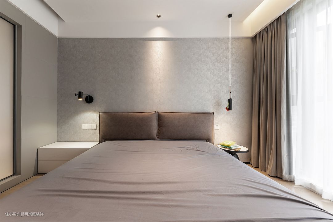 背景墙设计师没有选择乳胶漆和护墙板,而是选用了灰色带暗纹的墙纸铺贴,在床头两侧分别安装不对称的壁灯和吊灯,更能凸显当代年轻人对流行的追求和认知。