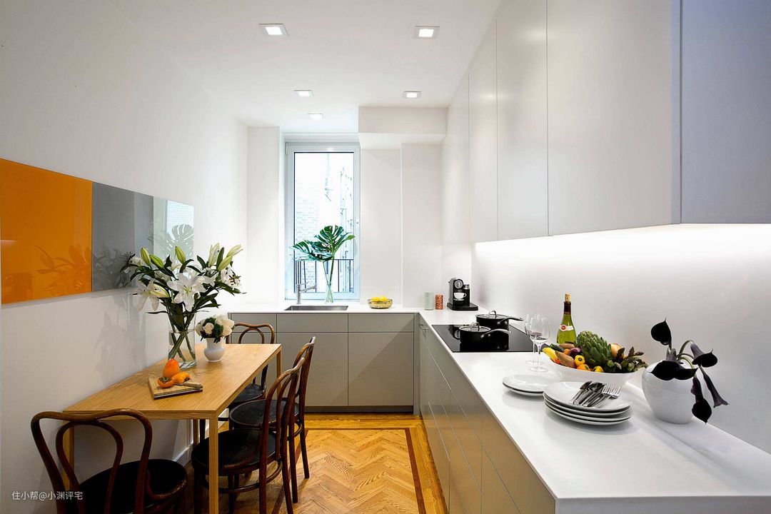 吊柜,不要全都装上门。至少要预留一个开放式的,而且要在这个开放式橱柜的背板上安装插座。这个开放式橱柜,后期可以用来放一些常用的厨电。