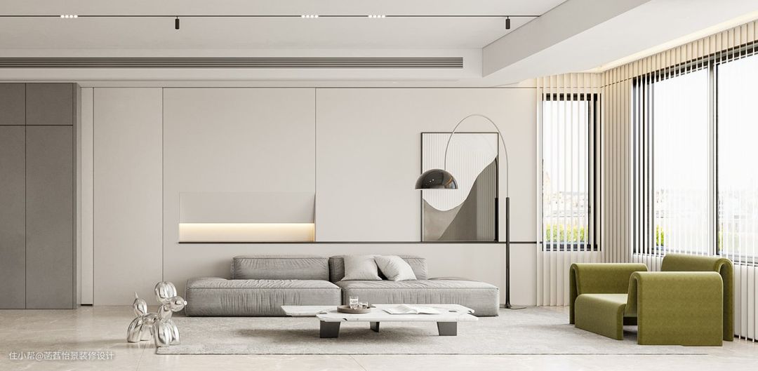 客厅的空间中,以灰白色为主,一组灰色调的沙发搭配着大面积的窗户,阳光透过玻璃,穿过百叶帘,照进室内,明亮而温馨。