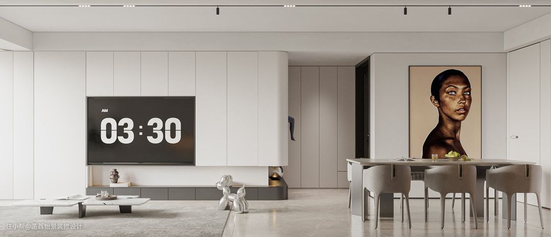 电视背景墙连接着入户的收纳柜,一体化的设计让空间更舒适统一。白色的柜体做的极简的设计,与墙面保持一致,让空间更舒适精致。