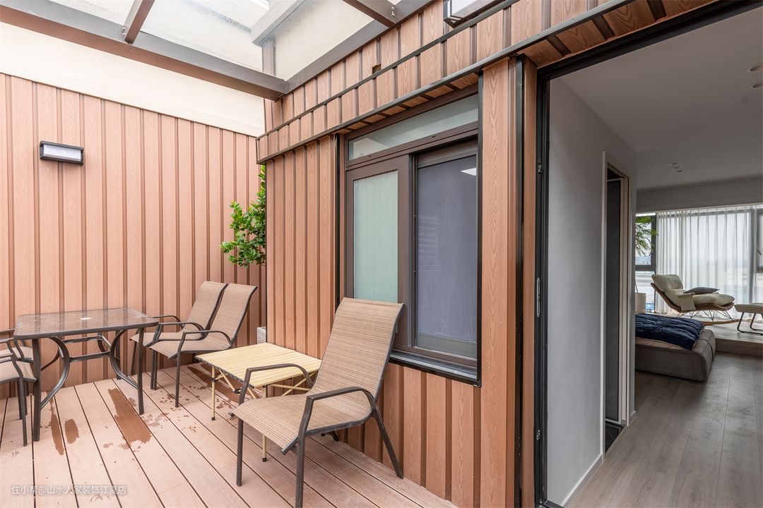 利用钢化玻璃将二楼露天阳台改造成阳光房,设计实用且耐看。地面墙面再铺上户外木,给人愈加沉静清爽的感觉。再摆上座椅和茶几,伴着斜阳日暮,家人娱乐、朋友聚会显得更加惬意。