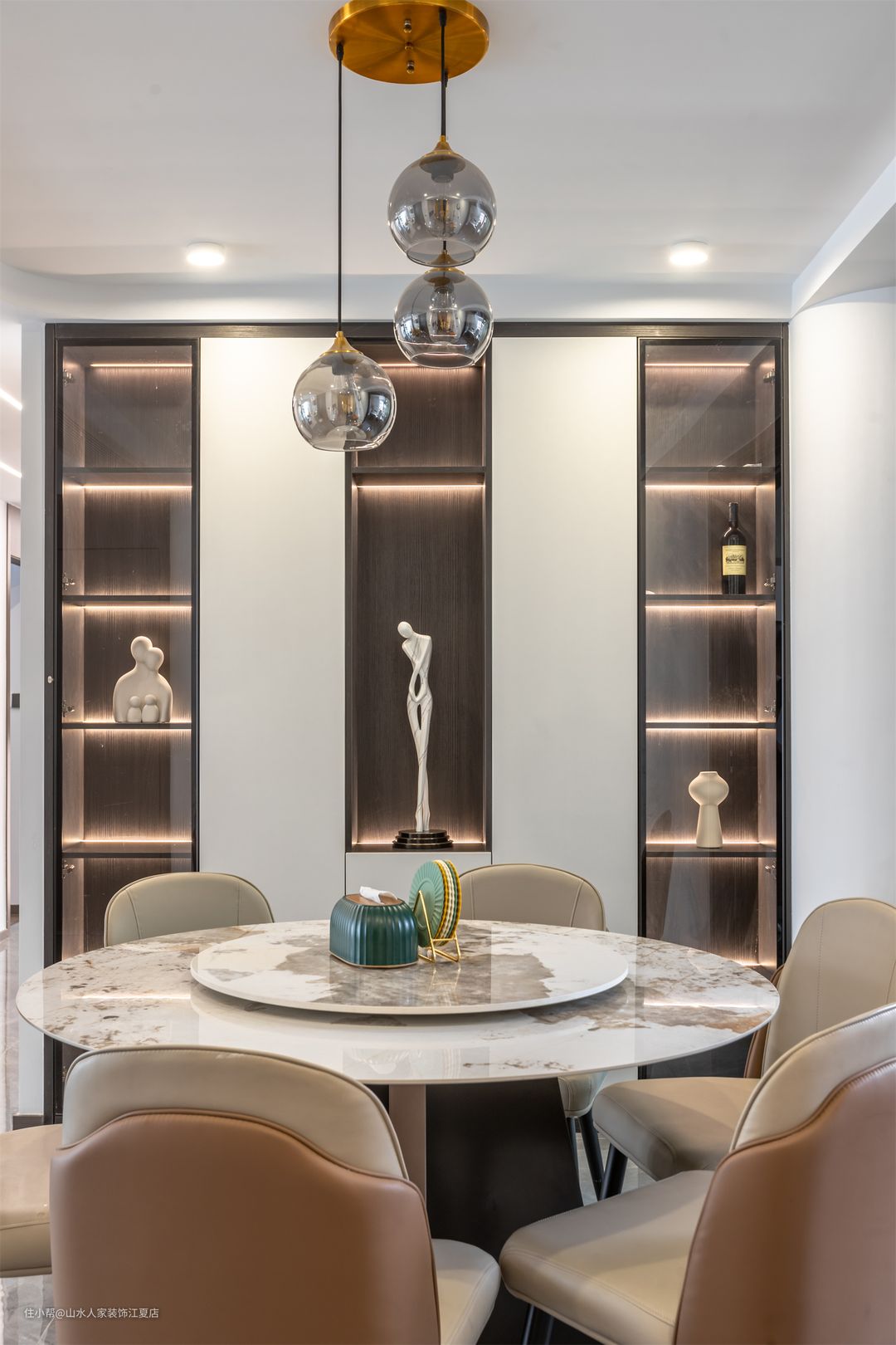 餐厅整体以白色为主,搭配上充足的灯光照明,显得比较宽敞大气。上方的吊灯内加入一些铜质金属,让餐厅看起来更有复古格调。岩板餐桌台面搭配铜质金属的桌脚,整个餐厅的设计简约而又优雅,有着独特的美感。