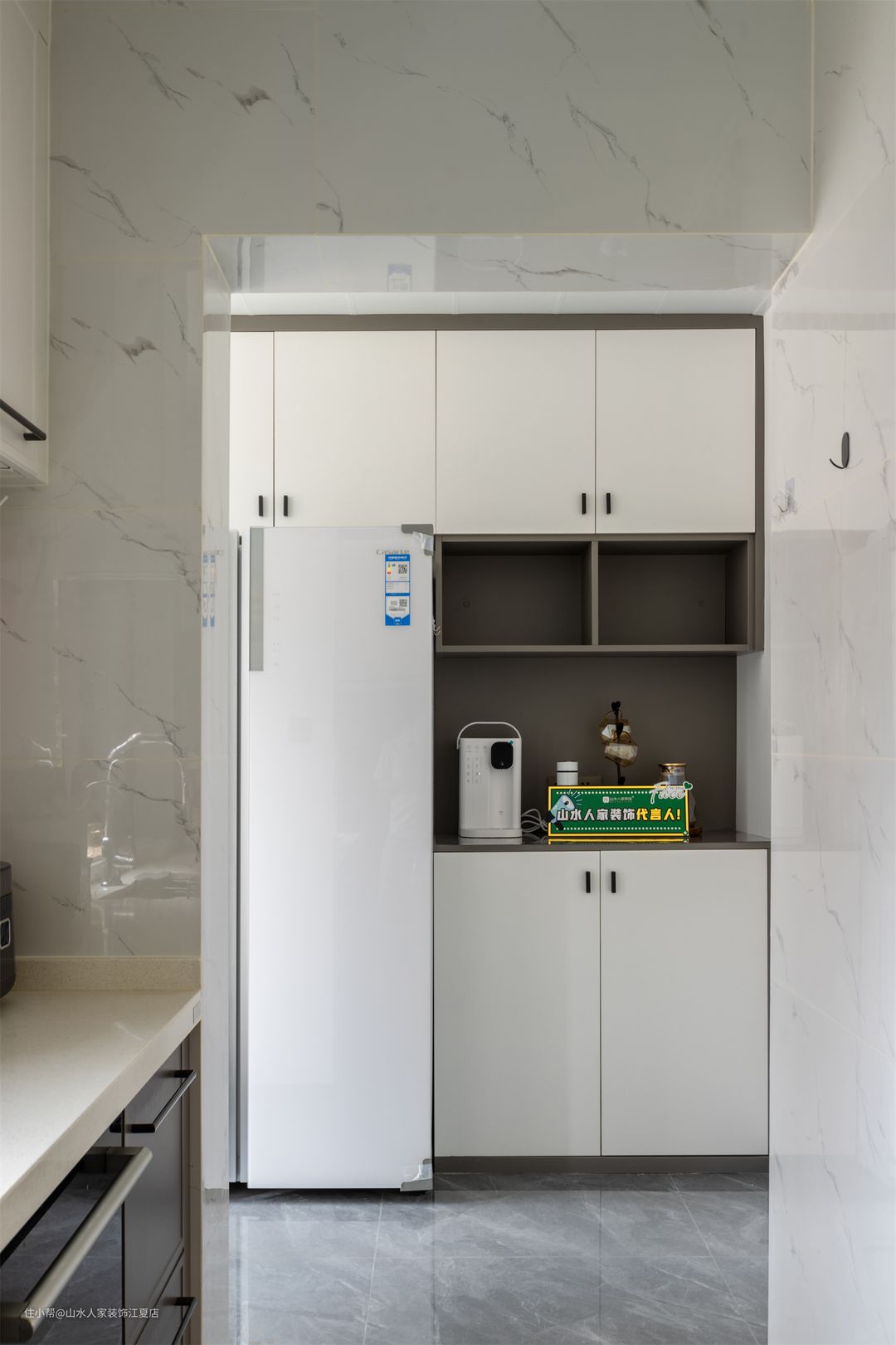 而厨房的另一边就是家里的北阳台,其间有一条较长的过道。于是乎整面墙因地制宜地打造了到顶柜墙,收纳更足。尤其在中间预留出一个冰箱位,进一步优化厨房的使用体验。