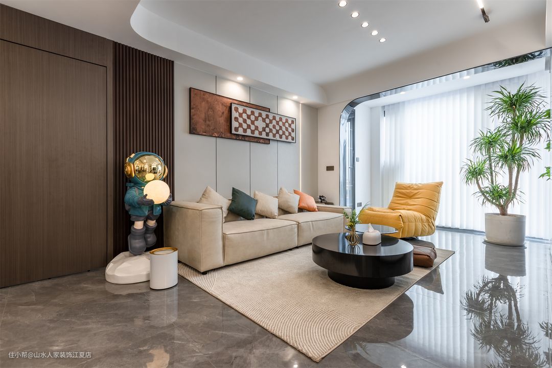 客厅里的家具陈设比较少,留出足够多的活动空间给家庭成员。暗夜黑的岩板茶几也选用的圆角造型,对家里小孩也有一定的安全防护。除此之外,还准备了一个橙色的毛毛虫沙发,平常的时候大人和小孩都喜欢窝在上面,悠闲地刷着手机看着电视。