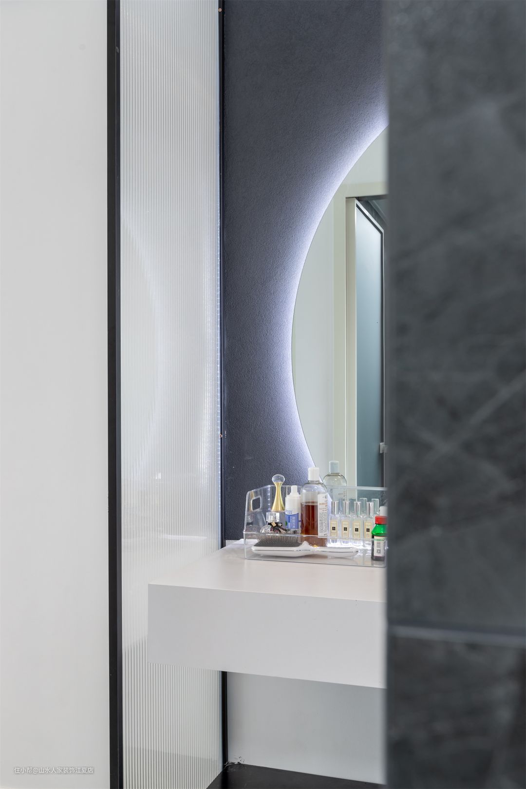 主卧卫生间直接将干区外置,有效实现了干湿区分离。浴室柜通体雪白,而墙面保持暗夜黑的色调。经典黑白配,简单而耐看。