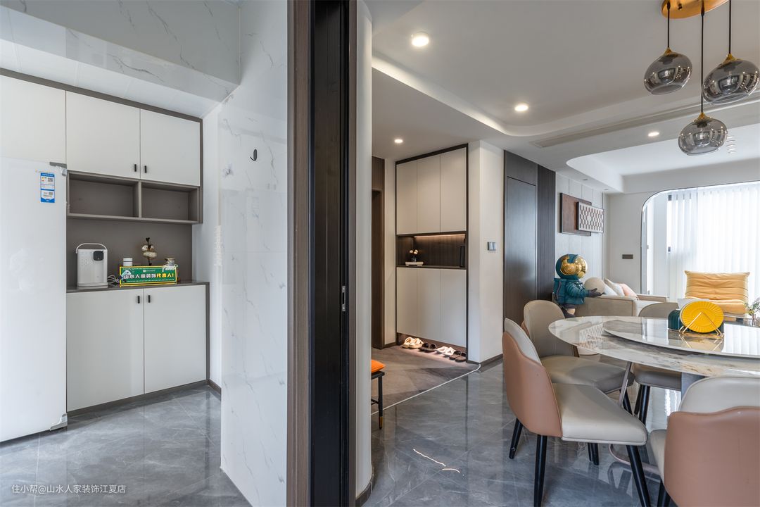 入户即见餐厅,但在登堂入室前,还需走过眼前的玄关。玄关区域虽然面积有限,但保障了极佳的功能性。一侧打造了到顶玄关柜,充当鞋柜和置物柜的功能,另一侧则放置了扫地机器人,方便清洁卫生。开放格及底部预留感应灯带,夜晚回家也能应声点亮。