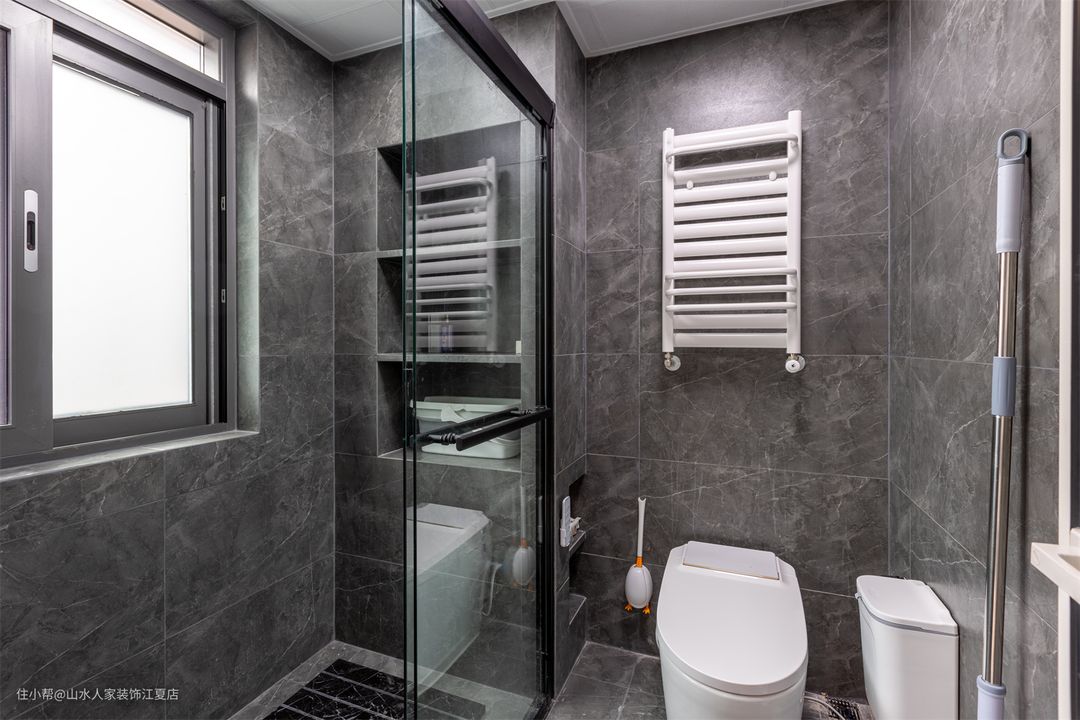 湿区则是墙地一体的灰色砖,显得通透而大气。在马桶区和洗浴区之间,用玻璃门相应隔开,由此维持了各区的私密性和稳定性。壁龛的设计,进一步填补了储物上的空缺。