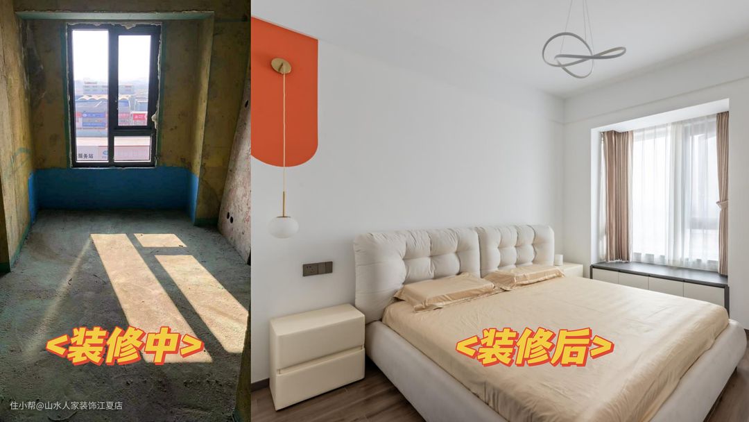 女儿房大抵上以素雅洁净的白色为主,承接起视觉的通透明亮。通过保留卧室飘窗,小女孩获得更多休闲娱乐的空间。墙面在灯具处做了橘色的分色,床饰也用到养眼的卡其色,无形中增添着生活趣味性。