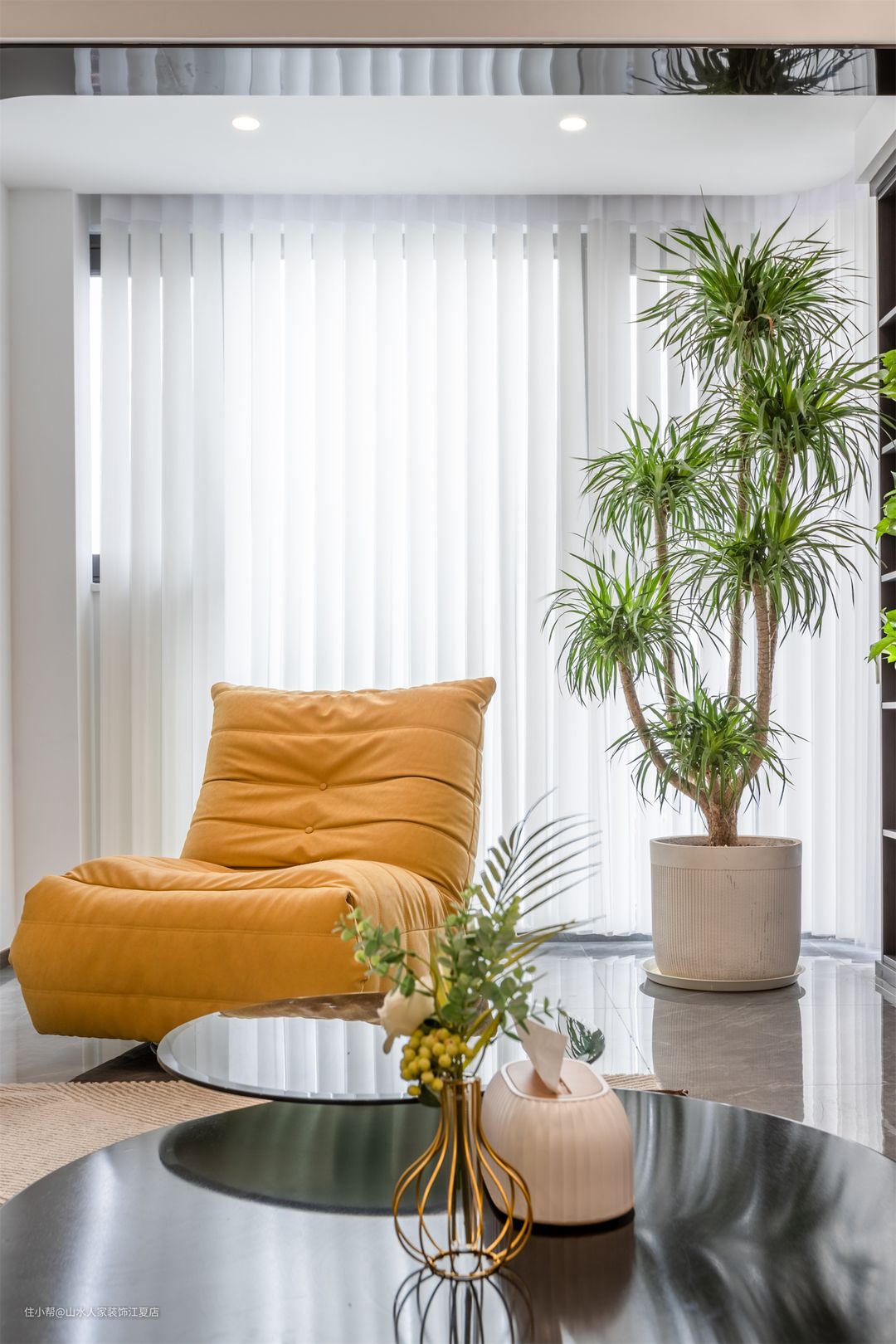 除此之外,通过抬高地面做成地台,由此获得一个超大的休闲区。大的开窗设计,迎接绚烂风景带给人的舒缓、放松。这里还放置了一个米色摇椅,靠背可调节,即是沙发又是床,搭配同款脚踏,舒适度更是升级。后方则是主卧的梳妆台,女业主喜欢呆的地方。