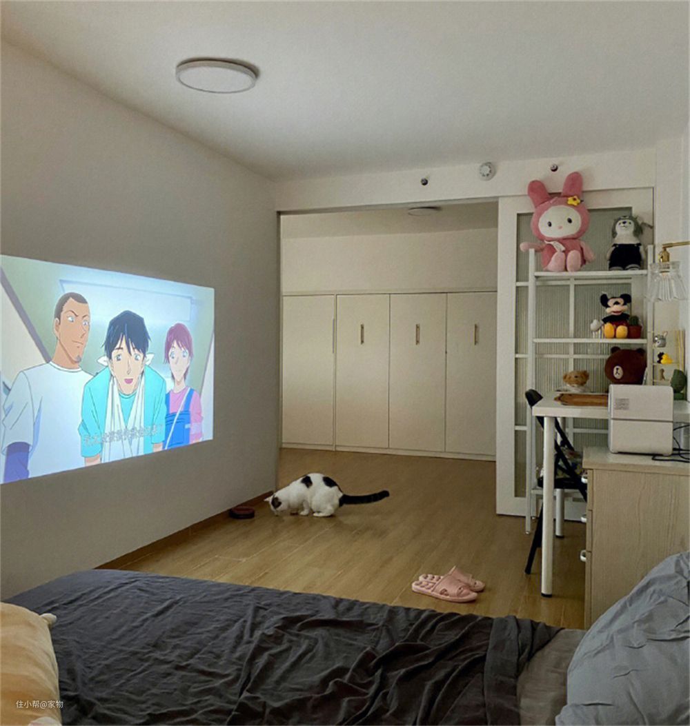 而内部的睡眠区域对于一个人生活的卧室来说,也算是很宽敞,不仅摆放了一张双人大床,还有一个尺寸不错的办公桌,相互组合下,满足这位姑娘睡眠、工作、化妆的需求。