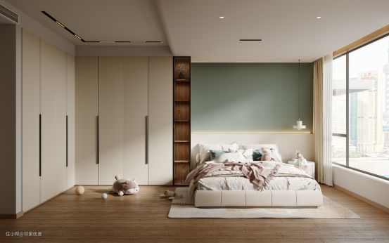 空间简约,色彩就要跳出来,大胆的运用当下流行的碧水绿搭配木色,传达个性化需求,协调一致的色彩让空间更加高级。空间内的物件彼此互融自洽,萌态可掬的玩偶,为原本安静的空间增加了几分愉悦与轻松感。
