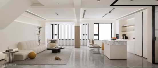 开放式的空间设计,减少隔断,内外通透,以一种简单的布局,还原最纯粹的居住形式。大面积的落地窗引入自然光,光影在整个室内缱绻流动,将空间无限拉长,带来一种温轻松惬意的居住感。
