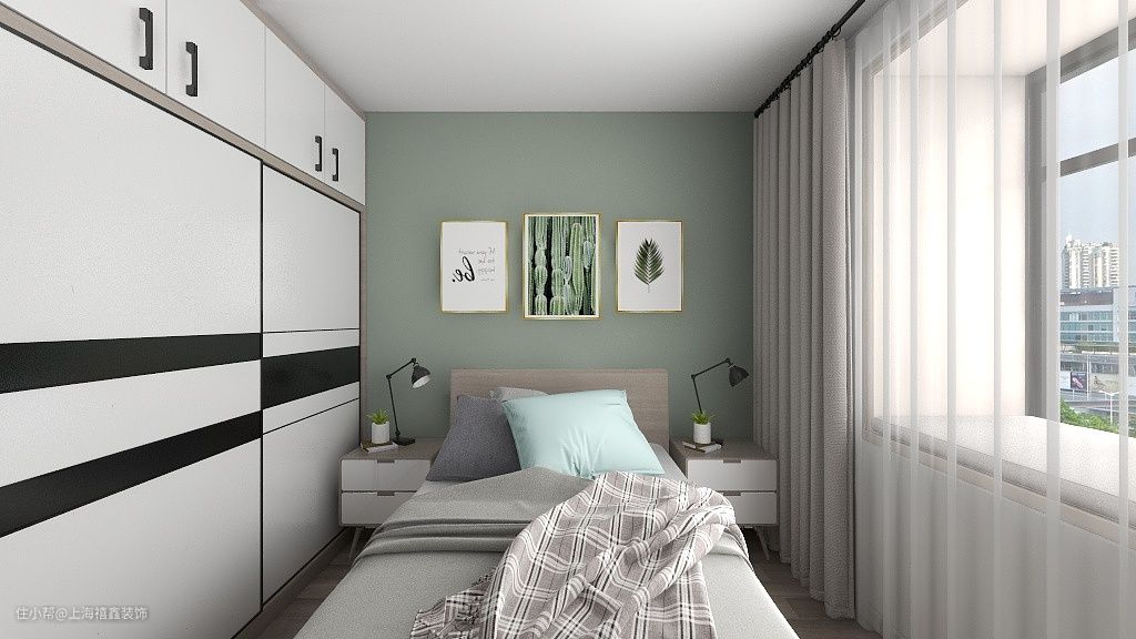 【次卧】次卧是给老人居住的,绿色的乳胶漆墙面搭配绿意盎然的挂画,清新又宜人。两侧床头柜上摆放绿植和台灯,方便起夜。飘窗铺上软垫,或坐或躺都很舒适。
