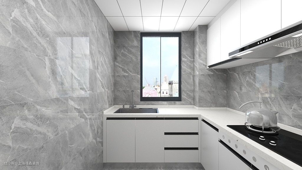 【厨房】厨房采用灰色大理石砖铺贴,耐脏且容易清洁。白色岩板料理台设计成L字形,通过合理地布局,能够让下厨者的动线越加流畅。上下的橱柜皆采刷白漆,无把手设计轻简自然。