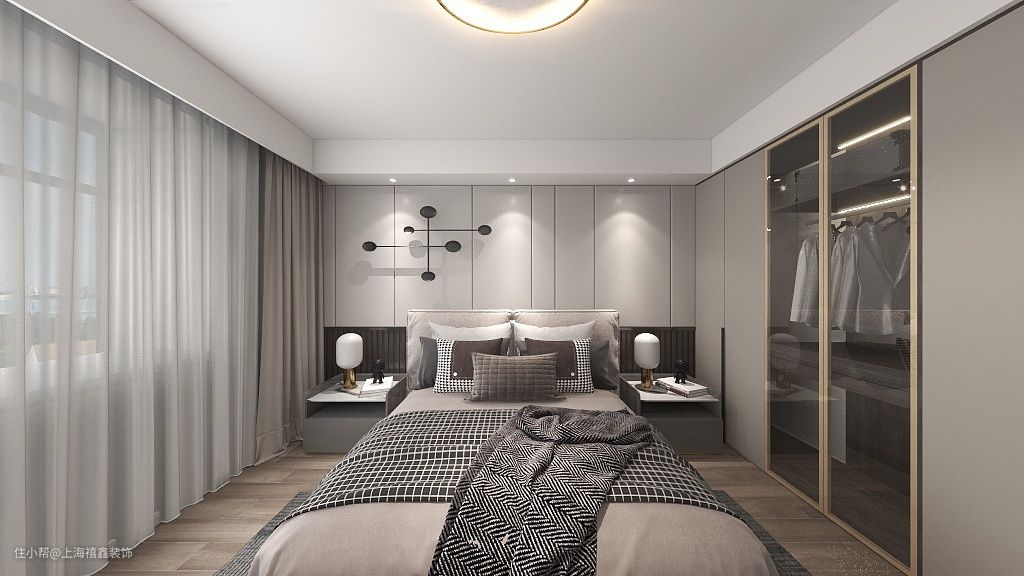 【主卧】主卧以高级灰为主色调,护墙板拼接半高的栅栏,纵向线条从视觉上拉高了层高。一整面的衣柜采用无把手设计,中间部分做了玻璃柜门,金属边框带来了轻奢的气息。