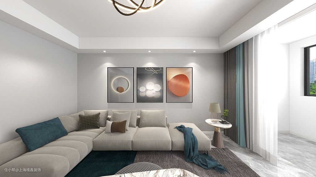 【客厅】微水泥背景墙自然纯粹,以三幅现代挂画点缀,增添艺术气息。灰色与雾霭蓝拼接的地毯上,L形沙发利用了拐角位置,棉麻材质触感柔软,舒适感拉满。