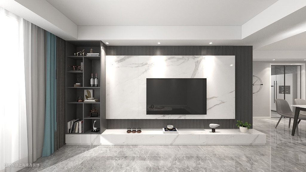 【客厅】窗外的光线透过纱帘涌入客厅,经过灰色的地砖与大理石护墙板的折射后,更显明亮通透。大理石后是格栅,旁边接上了一个开放式储物柜,下方是白色及地收纳柜。黑与白交错,简约感油然而生。