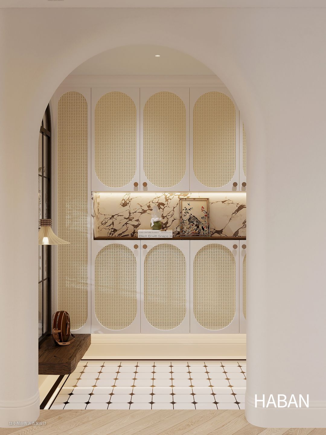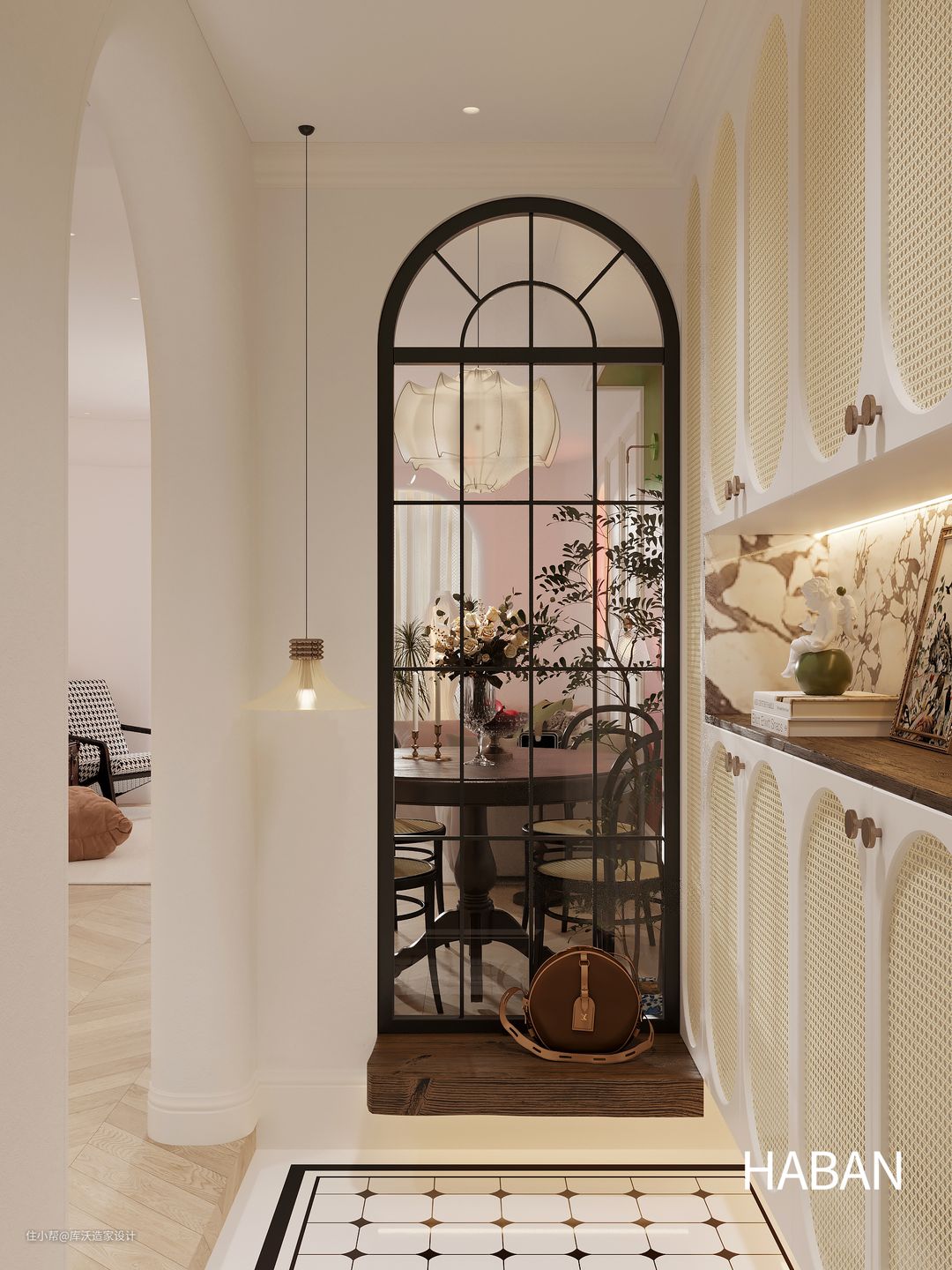 入户地面铺复古小花砖,靠墙设计定制藤编柜门鞋柜,在入户与客厅之间设计复古玻璃窗隔断,解决入户门一通到底的问题。在玻璃窗隔断底部设计悬空实木凳,方便换鞋。