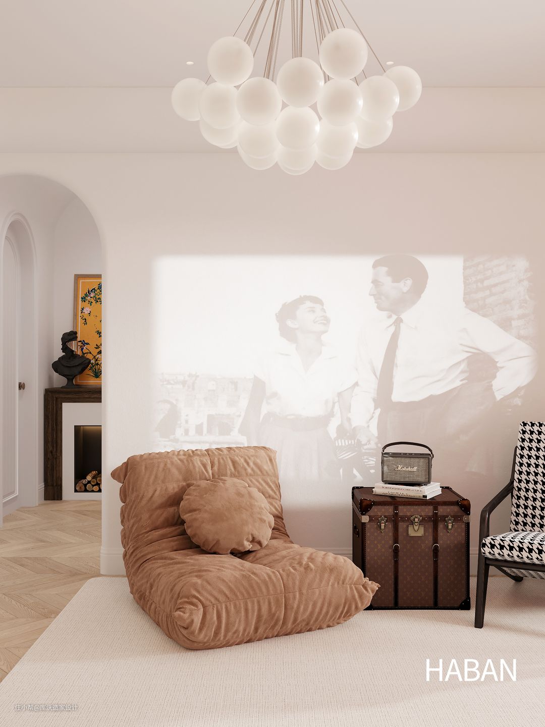 不做电视墙,墙面留白设计投影仪,沙发背景墙做轻法式石膏线条造型,客厅软装搭配布艺沙发、焦糖色单人沙发、单人椅、客厅不大用复古皮箱代替茶几。